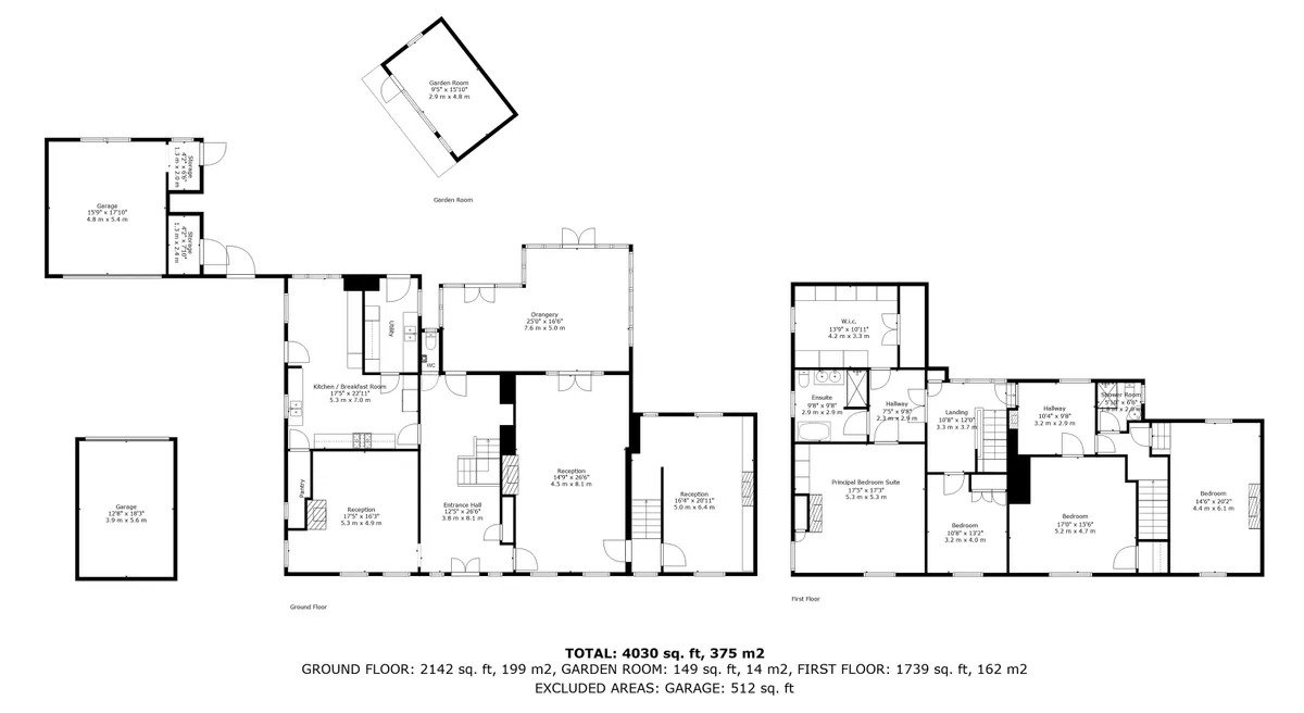 This beautifully presented detached Georgian residence is located within Great Baddow Conservation Area and offers classical interior décor with four double bedrooms including an impressive principal suite, four reception rooms including an Orangery and a bespoke kitchen/breakfast room. Being Grade II Listed Houghtons features high ceilings, large sash windows, column radiators, balustrade staircases and traditionally styled bathrooms. Approached via a private gated entrance providing privacy leading into an ample frontage of paved parking areas and access to both garages, which also offer useful storage. A grand and welcoming entrance hall features a main balustrade staircase to the first floor with reception rooms either side – the main through reception has a feature fireplace with doors into the Orangery which has sun blinds and tiled floor. There is a further inner hallway with secondary staircase leading to the first floor and a door into a further dual-aspect reception room with built-in bookcases and a woodburning stove. A third reception/dining room to the front aspect features another feature fireplace and beautiful sash windows. All the reception rooms feature large sash windows flooding the rooms with natural light. The kitchen/breakfast room offers a bespoke range of units with an electric Aga, butler sink and space for breakfast dining. There is a walk-in pantry and separate utility room. To the first floor the principal bedroom suite has a 17ft. Bedroom with feature fireplace and built-in wardrobes, adjacent en-suite bathroom with roll top bath/separate shower and walk/in dressing room. There are three further double bedrooms and a newly fitted shower room. The secondary staircase provides opportunity to create an Annex (reception/bedroom and shower room). The landscaped rear gardens offer privacy with a large sun terrace behind the property offering ample space for entertaining and featuring a newly installed swim spa. The gardens are well stocked w